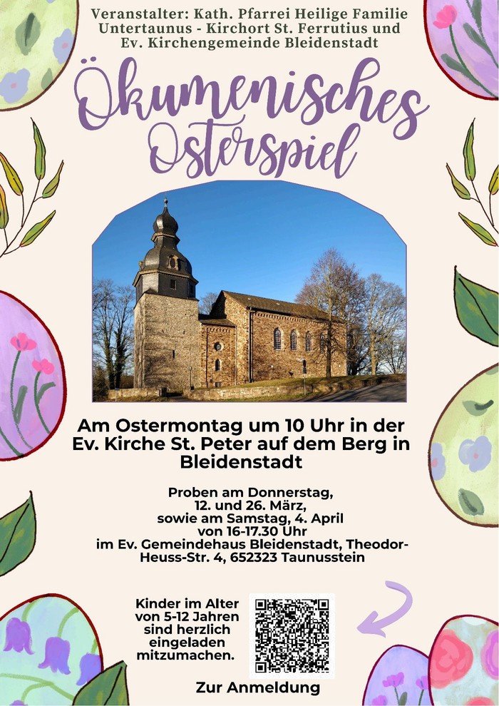 Nach der großen Freude am Krippenspiel geht es weiter: Wir laden herzlich zum ökumenischen Osterspiel ein! Gemeinsam möchten wir die Ostergeschichte in spielerischer Weise entdecken und im Rahmen eines Familiengottesdienstes lebendig werden lassen.